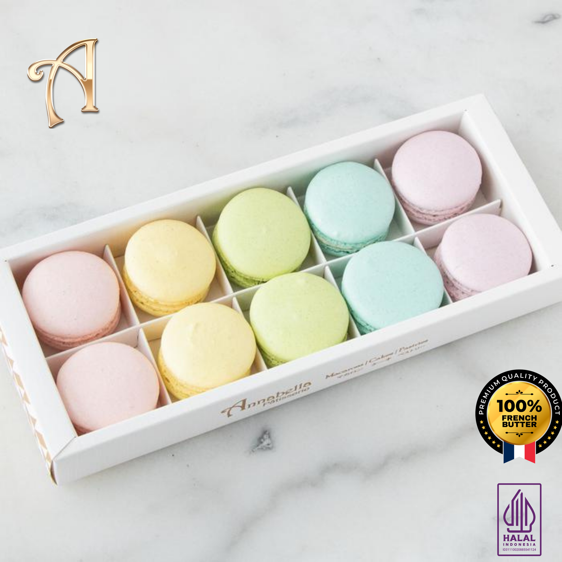 • Bahan: Macarons: Tepung almond, putih telur, gula halus, mentega dan rasa masing-masing.  Kue: tepung, telur, gula halus, mentega dan rasa masing-masing.  Mungkin mengandung jejak kacang selama produksi, pemanggangan &; pembuatan.